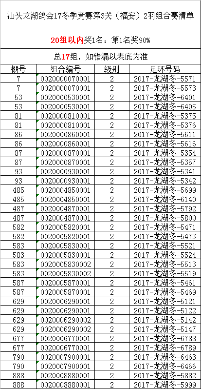 汕头龙湖鸽会17冬季竞赛第3关(福安)2羽组合赛,总17组,清单