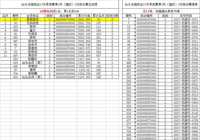汕头龙湖鸽会17冬季竞赛2羽组合赛总成绩