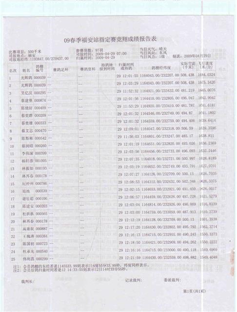 汕头龙湖鸽会2009年春季竞赛福安站指定赛成绩,请校对