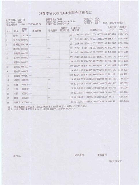 汕头龙湖鸽会2009年春季竞赛福安足环C成绩,请校对