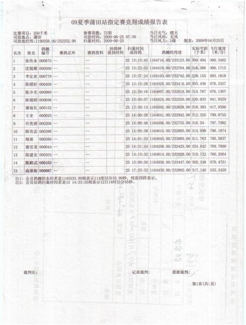 汕头龙湖鸽会2009年夏季竞赛莆田指定成绩,请校对