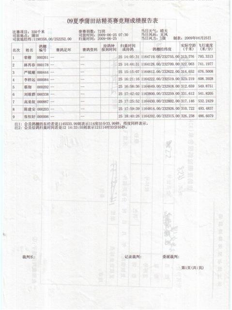 汕头龙湖鸽会2009年夏季竞赛莆田精英赛成绩,请校对