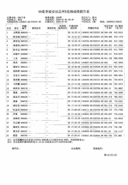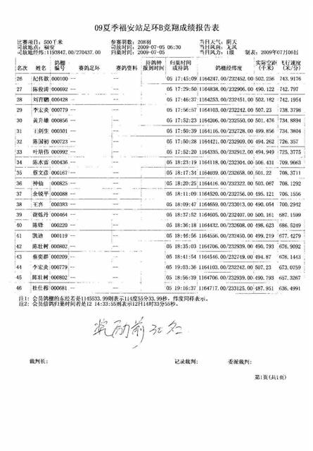 汕头龙湖鸽会2009年夏季竞赛福安足环赛B项成绩,请校对
