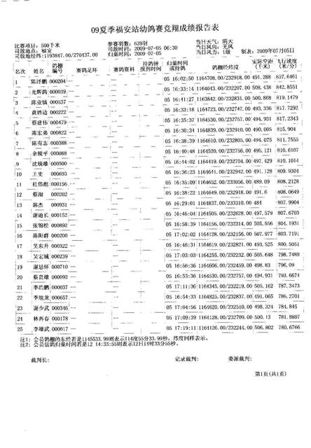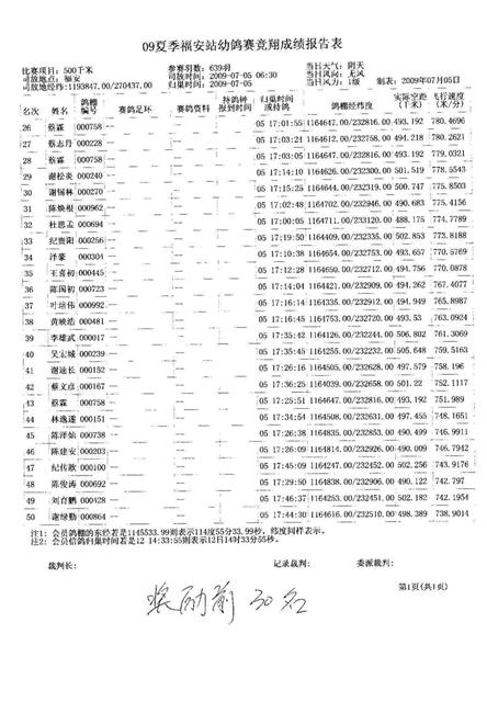 汕头龙湖鸽会2009年夏季竞赛福安10元足环成绩,请校对