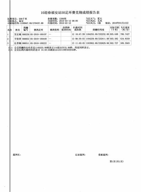 汕头龙湖鸽会2010年迎春福安站50元足环赛成绩,请校对