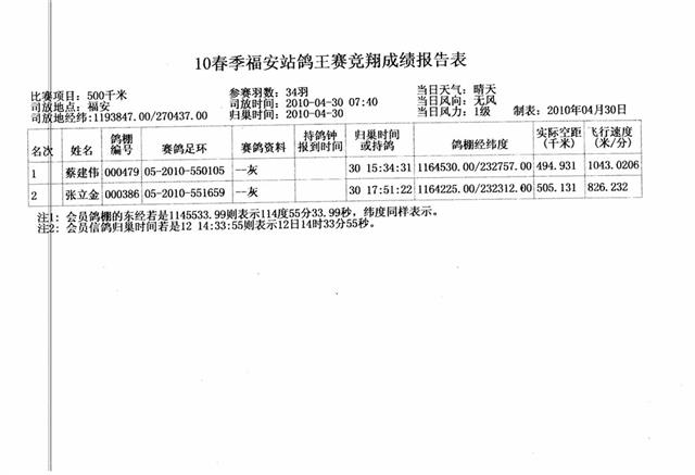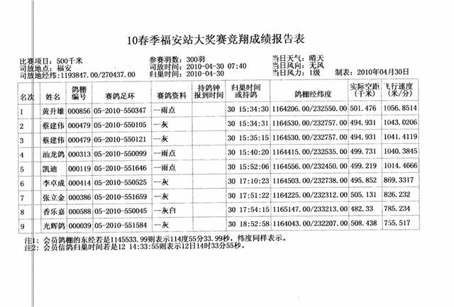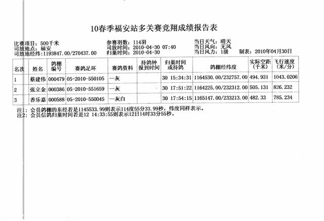 汕头市龙湖区信鸽协会2010年春季竞赛福安站成绩,请校对