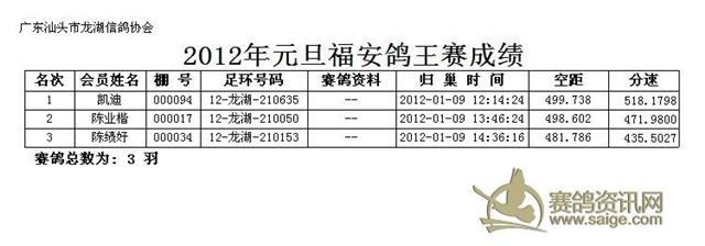 汕头市龙湖区信鸽协会2012年元旦竞赛福安鸽王赛成绩,请校对