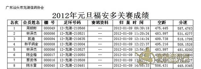 汕头市龙湖区信鸽协会2012年元旦竞赛福安多关赛成绩,请校对