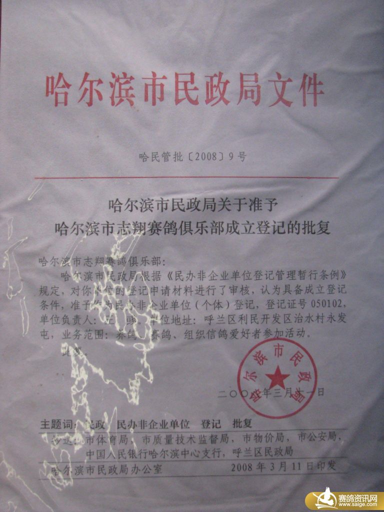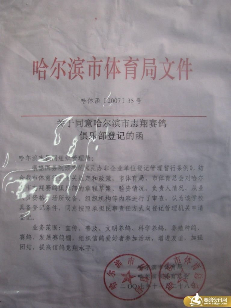 哈尔滨赛鸽中心志翔公棚民政局体育局文件