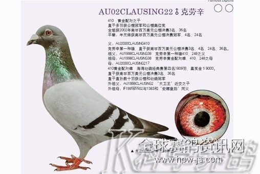 2006年开始养鸽的张宝山先生虽然鸽龄不长,却在公棚赛中取得了许多不俗的成绩。初养信鸽时张先生经别人的介绍引进了不少种鸽,但因为对信鸽的理解还不太到位,加之种鸽质量也差一些,2007年作出的幼鸽交公棚120羽仅入围3羽,于是他将这些种鸽全部淘汰。随后张先生在孟武的拍卖会上引进了几羽大卫•克劳辛的鸽子,之后又去孟武家中买下了大卫•克劳辛“410”直子——一羽2002年作出的砂眼灰雄鸽。引进后10天他便给这羽灰雄配了一羽从日本引进的杨阿腾血系鸽(也是2002年作出)。2008年春这一配对作出了6羽幼鸽,均送交公棚参赛,其中方圆顺达公棚1羽,河北影视公棚3羽,顺天公棚2羽。这一配对后代在2008年秋公棚比赛中取得了不俗的成绩,分别获得了方圆顺达公棚决赛第300多名,顺天公棚320公里第14名、200公里第8名、决赛分别为第160多名和第180多名,河北影视公棚决赛第188名(张先生将这羽赛鸽拍回,作出的后代又获得了2009年秋方圆顺达公棚决赛第93名)和第360多名。那年张先生还获得了方圆顺达公棚决赛团体冠军,入围5羽,成绩分别为第13名、39名、63名、137名和344名,而冠军团队中有两羽大卫•克劳辛血统的赛鸽。