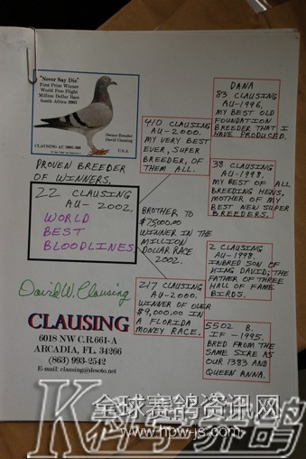 张先生觉得大卫•克劳辛血统的鸽子抗逆性比较好,且在公棚的存活率比较高,归巢稳定性也较好,但是他对此路血统鸽的速度不太满意。而张先生当年拍得的几羽种鸽年龄都比较大,基本上都是2002年的种鸽。为进一步提高它们的飞行速度,所以他想先在不杂交的情况下让此路鸽子年轻化,年轻的子代再进行杂交,然后通过比赛来检验子代种鸽是否合格。杂交所使用的种鸽是赵宝才先生支援的几羽带有詹森血统的鸽子。
