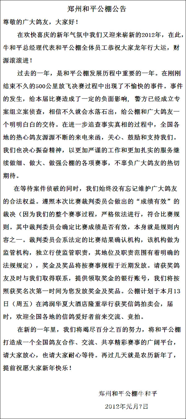 另据郑州市金水区人民法院有关人士透露,此案案发后,宋国锋曾于今年1月份委托律师到法院递交了民事起诉状,起诉此次比赛的主办单位——郑州和平公棚以及河南省信鸽协会,以无理取消其成绩而要求对方兑付奖金,但随后宋国锋撤诉。