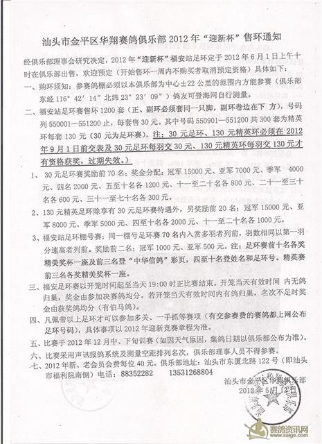 汕头市金平区华翔赛鸽俱乐部2012迎新售环通知