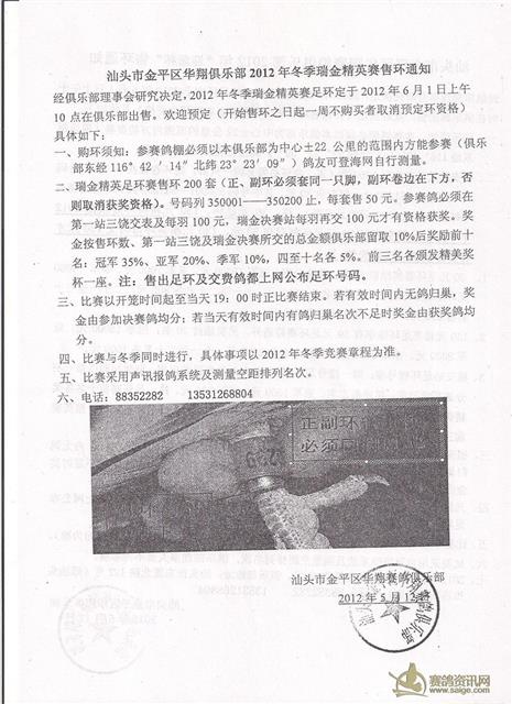 汕头市金平区华翔赛鸽俱乐部2012冬季瑞金精英赛售环通知