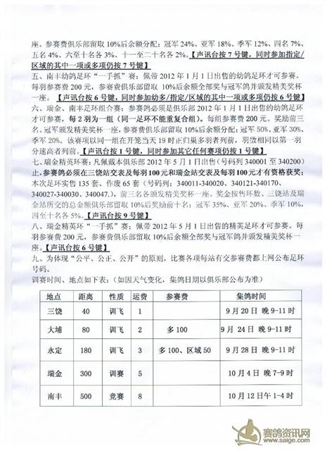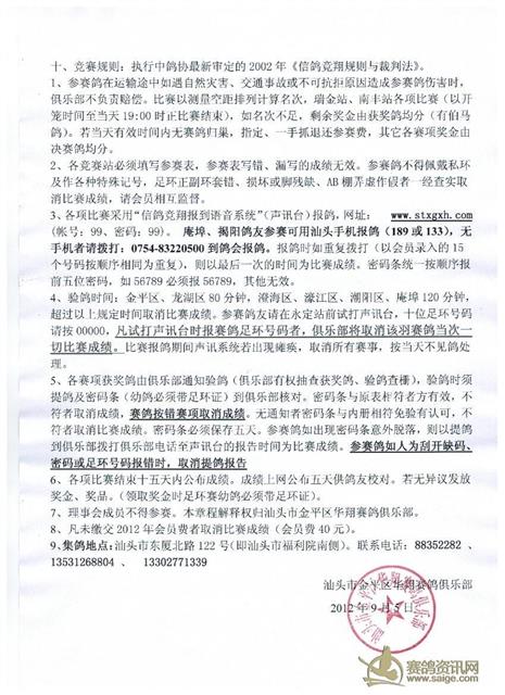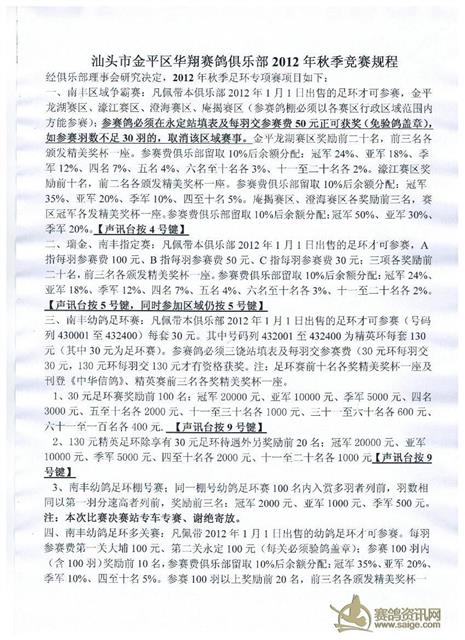 汕头市金平区华翔赛鸽俱乐部2012年秋季竞赛规程
