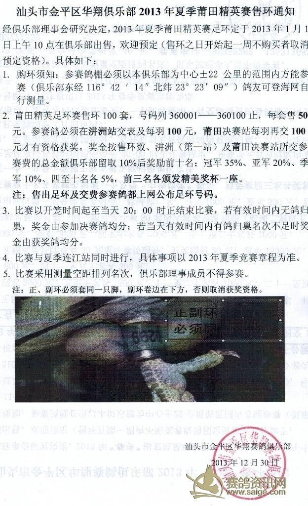 汕头市华翔俱乐部2013年夏季莆田精英赛售环通知