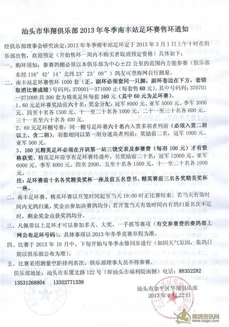 汕头市华翔俱乐部2013年冬季南丰站售环通知