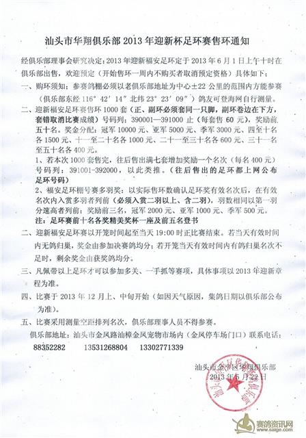 汕头市华翔俱乐部2013年迎新福安足环赛售环通知