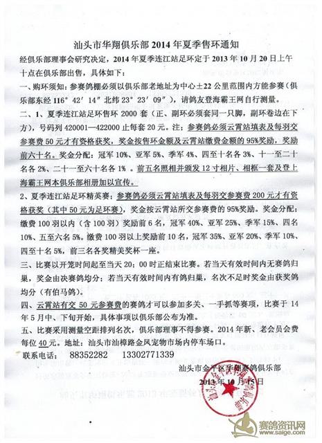 汕头市华翔俱乐部2014年夏季售环通知