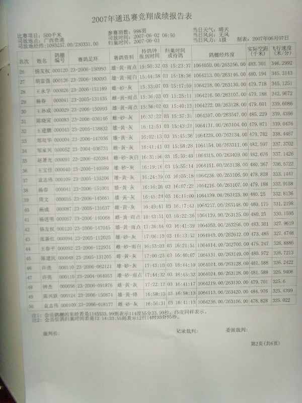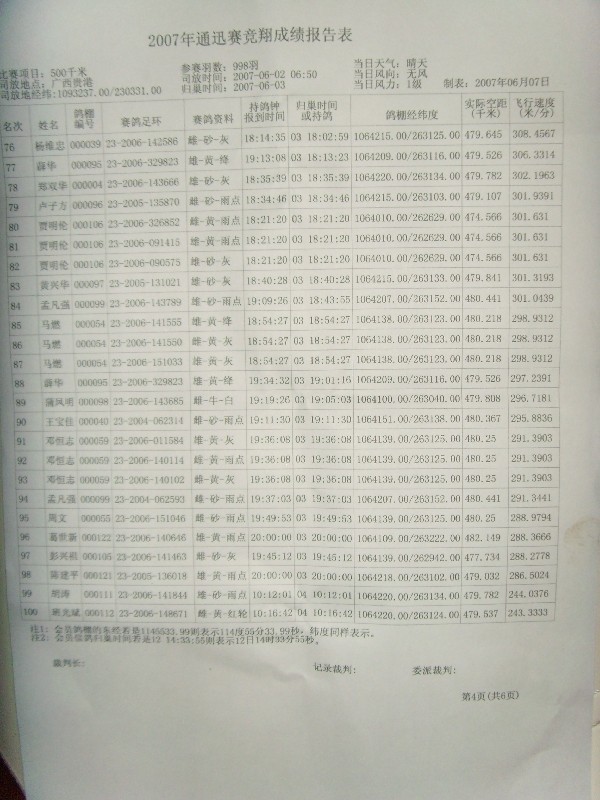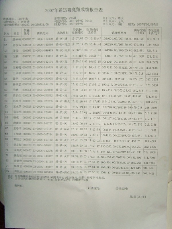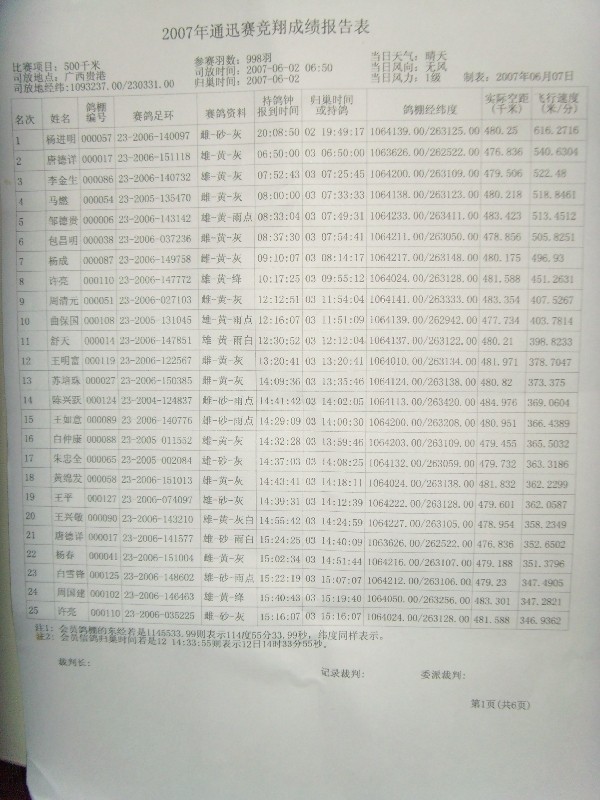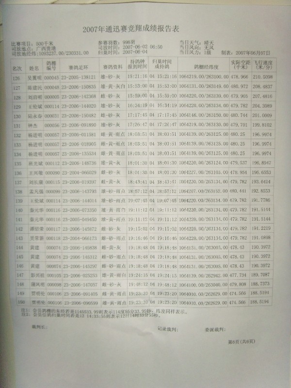 贵阳市小河区信鸽协会500公里通讯赛成绩