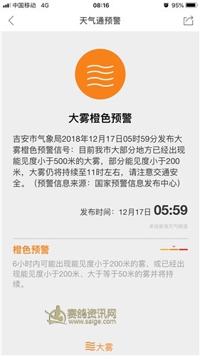尊敬的鸽友: 17日上午9点30分司放地天气仍然大雾,能见度低,不适宜放飞比赛,鸽车决定拉回公棚,决赛时间另定。感谢大家的支持、、、、