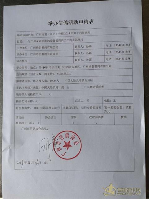 广州浩羽(从化)公棚举办信鸽活动申请书