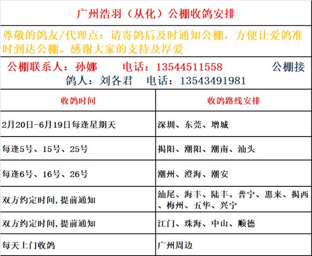 广州浩羽(从化)公棚收鸽安排 各地代理点:
