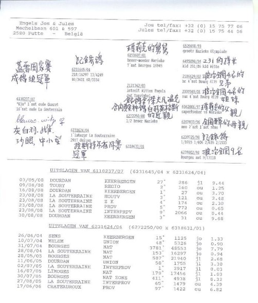 蓋雷國家賽成鴿組冠軍得主 :世界著名鴿舍——英格斯兄弟 林天章與英格斯兄弟   關於英格斯兄弟鴿舍的名氣相信不用我多加介紹各位鴿界朋友一定對他們耳熟能詳.而讓大家第一個聯想到的就是他們的鎮舍之寶“231”.6616231-86♂灰色.白羽.黃眼.它的下代發揮至今已經到了第6代..世界各地著名的賽鴿好手.幾乎都擁有231這一路的下代.甚至也成為他們鴿舍內最重要的基礎種鴿。   然而“231”的子代中最具有世界代表性的乃是6495178-94♂灰白羽。俗稱“178”與6237584-90♂灰色。俗稱“584”。這2支超級種鴿的下代在歐洲的賽事中拿下全國冠軍與全國鴿王还有奧林匹克代表鴿王不計其數。   當你走進英格斯的小辦公室,你將看到琳瑯滿目的獎狀與獎杯,还有牆壁上吊滿了歷年來榮獲優秀紀錄的銘鴿照片,你不禁地會想,他們是怎麼作到的 ?   英格斯的养鴿家族最主要是兄弟倆喬斯英格斯(69歲,菜農,己退休10年)。裘利英格斯(68歲, 菜農,已退休8年)。但兄弟倆從小就跟父親福洛英格斯學養鴿,所以論養鴿也有將近60年的历史了。雖然曾榮獲過8次國家賽冠軍、81次省冠軍,但今天再度榮獲蓋雷國家賽成鴿組冠軍,他們的興奮程度扔不減當年。 冠軍鴿介紹 :   6110237-07♀灰白羽、雌、中小型、沙眼. 本身記錄 :   蓋雷國家賽成鴿組冠軍.拉斯特年國家賽成鴿組16名。   在父親的家族裡可以看到有231的血統,而冠軍鴿已經是231的第5代孫子。还有一支2121362-03♀,需要特別介紹一下,它是比利時著名強豪傑夫凡溫克,舍內超級銘種鴿6396513-98♂“白英格”的近親孫女,而“白英格”已做出下代入赏維斯全國冠軍、BDS全國鴿王冠軍、KBDB省鴿王冠軍、亞精頓全國分区冠軍、C、W、F半全國鴿王冠軍、亞軍、季軍、等等,今年傑夫凡溫克,舍內又有2支超級記錄鴿,(同父同母姐妹),它們也是明年初奧林匹克鴿王代表鴿,這2支也是“白英格”的第5代。然而“白英格” 也是“231”的第3代孫子。再仔細看看蓋雷國家賽成鴿組冠軍的父母親血系內還出現玛莉克的名字, 玛莉克6153558-01♀雨奌、雌、它是2003年奧林匹克鴿王代表鴿。目前英格斯兄弟最喜歡用“231”這一路血系來配上“玛莉克”這個血系,這樣的組合下代特別發揮。 蓋雷國家賽成鴿組冠軍鴿(1) 蓋雷國家賽成鴿組冠軍鴿(2) 蓋雷國家賽成鴿組冠軍鴿(3) 蓋雷國家賽成鴿組冠軍6110237-07血統書 白羽英格斯血統書 蓋雷國家賽成鴿組冠軍鴿的母親(1) 蓋雷國家賽成鴿組冠軍鴿的母親(2) 蓋雷國家賽成鴿組冠軍鴿的母親(3) 蓋雷國家賽成鴿組冠軍鴿的父親(1) 蓋雷國家賽成鴿組冠軍鴿的父親(2) 蓋雷國家賽成鴿組冠軍鴿的父親(3)   蓋雷國家賽成鴿組第9名這一支超級記錄鴿6154673-06♀灰色、中小型、它的特色  :手感差、腰部小、翹尾、龍骨短、羽條差、完全不起眼的鴿子。但是它的自身成績告訴我們它是讓主人名利双收的頂尖好鴿,雖很醜卻很贴心不是嗎 ? 蓋雷國家賽成鴿組第9名(1) 蓋雷國家賽成鴿組第9名(2) 蓋雷國家賽成鴿組第9名(3) 蓋雷國家賽成鴿組第9名6154673-06血統 蓋雷國家賽成鴿組冠軍鴿的親哥哥6154585-06♂灰色、沙眼。中小型、小头、羽條漂亮、育種眼很強勢。本身最優成績 : 2006年波治國家賽469公里、第99名 26984羽。 2007年蓋雷國家賽580公里、第12名 2410羽。 2006年亞精頓國家分區賽545公里、第194名 5642羽。 2006年拉斯特年國家分區賽584公里、第278名 5537羽。 蓋雷國家賽成鴿組冠軍鴿親兄6154585-06(1) 蓋雷國家賽成鴿組冠軍鴿親兄6154585-06(2) 蓋雷國家賽成鴿組冠軍鴿親兄6154585-06(3) 蓋雷國家賽成鴿組冠軍鴿的兄弟6154585-06血統書 鴿舍外觀(1) 鴿舍外觀(2) 鴿舍外觀(3) 國家賽協檢驗官放入檢測布 國家賽協檢驗官核對冠軍鴿腳環 國家賽協檢驗官正準備檢測材料 獎杯展庁(1) 獎杯展庁(2) 獎杯展庁(3) 銘鴿相片(l) 銘鴿相片(2) 銘鴿相片(3) 室內蔬菜種植場 室外蔬菜種植場 英格斯兄弟鴿舍歷史成績   筆者在採訪時順便題到要購買冠軍鴿,但英格斯兄弟很做難,因為它要做招牌鴿同時2009年也許再參加比賽,所以暫時不考慮出售,但為了與筆者將近19年合作交情,誠心提供蓋雷國家賽成鴿組冠軍鴿的親哥哥6154585-06♂,希望幸運的中國強豪能夠擁有它。