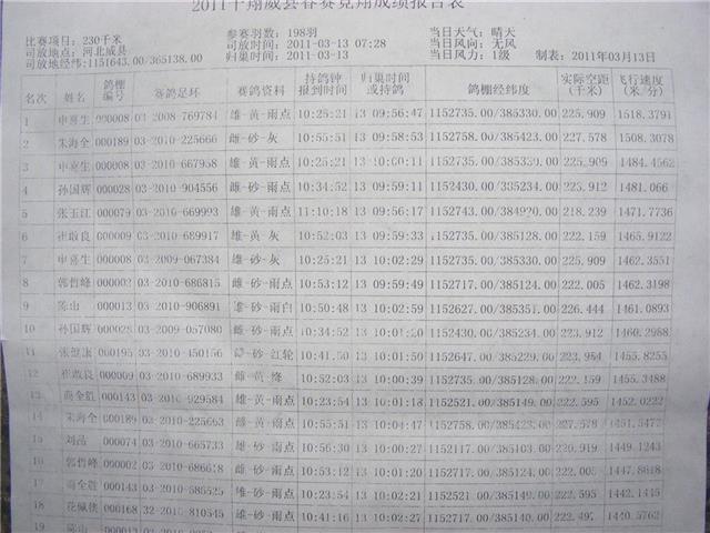 保定千翔赛鸽文化传媒中心210公里短程精英赛临时成绩