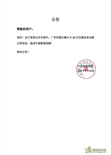 广东恒通秋棚第九站训放未收到归巢短信公告