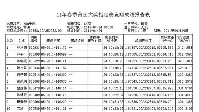 2011汕头龙湖鸽会春季莆田大奖指定赛成绩,请校对