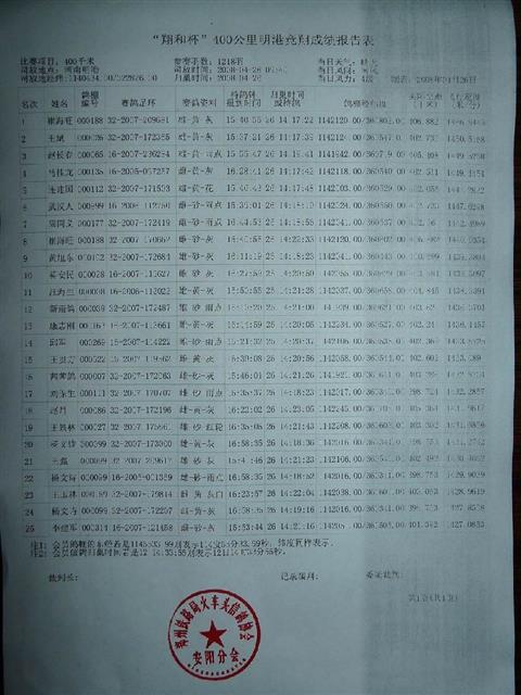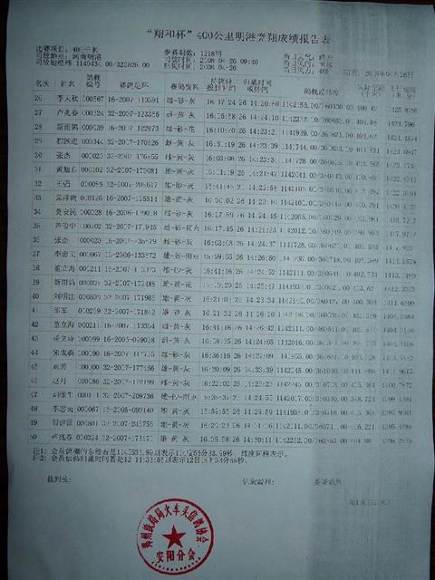 安阳铁路信鸽协会400公里"翔和杯"成绩单