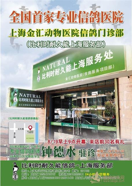中国首家专业信鸽医院-上海金汇动物医院信鸽门诊部(比利时耐久能上海服务处),已于2013年8月19日(星期一)上午9时,假上海市闵行区虹桥镇红松路59号隆重开幕;当天来自上海各地鸽友及来宾,高朋满座,显得热闹非凡。 据了解,上海金汇动物医院信鸽门诊部,特聘来自台湾中兴大学名兽医学士钟德水兽医师驻诊,相信定能对上海信鸽疾病医疗做出贡献。此外,开业现址同时设立比利时耐久能(NATURAL)上海服务处,直接供应欧洲著名信鸽保健品,为鸽友提供便捷迅速的各项服务,为提供信鸽产业水平与世界接轨。 竭诚欢迎鸽友踊跃莅临参观赐教。