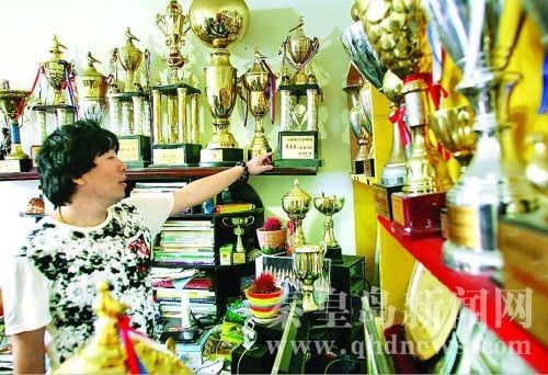 家里大大小小的奖杯占了两面墙。记者 胡博 摄