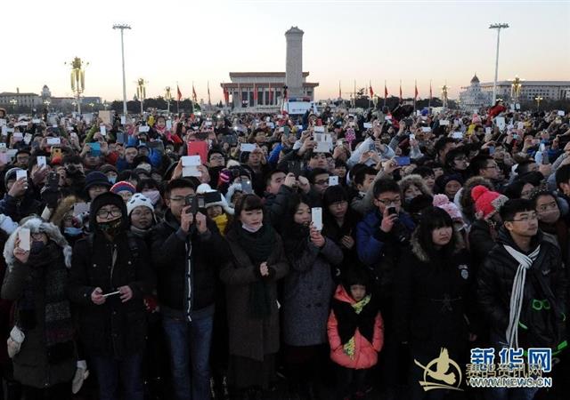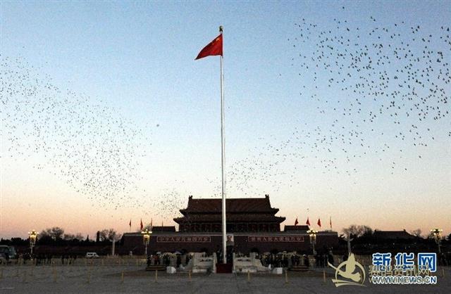 2015年1月1日,天安门广场放飞万羽和平鸽。当日清晨,北京天安门广场举行隆重的升国旗仪式。来自全国各地的1.9万名群众观看升旗仪式,迎接2015年的到来。 新华社记者唐召明摄