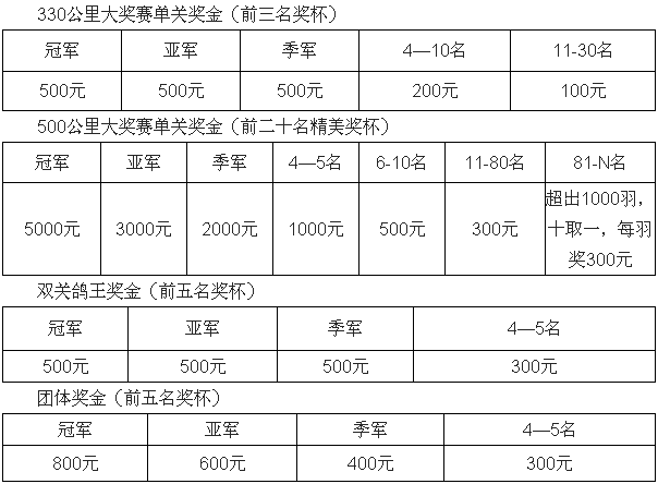 大赛按环售1000枚设奖,足环、奖杯、奖状由鸽会提供,无论售环多少,奖金照发!