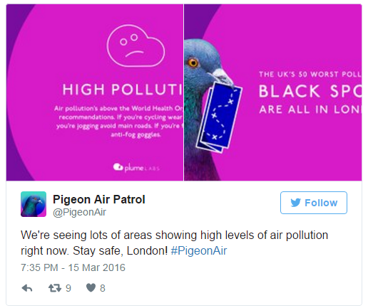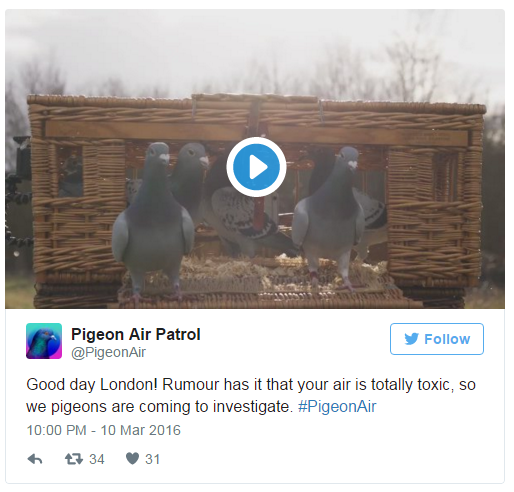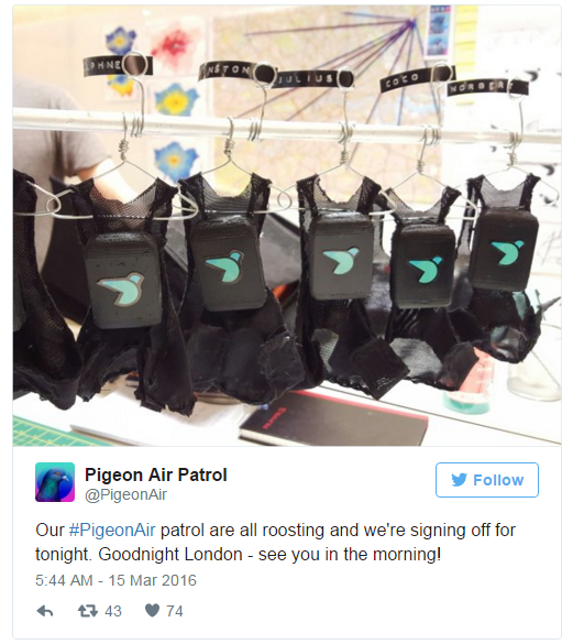 【环球科技3月16日报道 记者 心月】监测空气质量的手段可谓多种多样,但是利用鸽子监测你之前见过吗? 为了更好地监测伦敦的空气质量,伦敦一家公司推出了一个称为Pigeon Patrol的项目,并组建了一支“鸽子空中巡逻队”,每只鸽子身上都背着一个小背包,而背包将能检测中空气中的二氧化氮浓度及臭氧污染物。 据了解,未来两天内由10只鸽子组建的这只“鸽子空中巡逻队”将飞越伦敦上空,而通过它们身上背包监测获得的污染数据也将通过该项目官方Twitter账号实时发布。 怎么样,是不是看起来萌萌哒?有一种疯狂动物城的即视感!