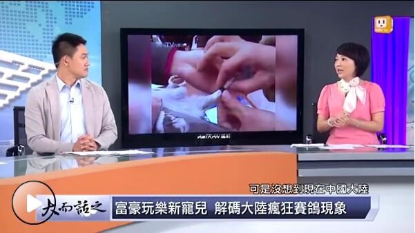 主持人(女):中国大陆富豪的热门运动赛事据说不是高尔夫而是赛鸽。 主持人(男):我一直以为赛鸽是台湾民间独有的一种娱乐方式,不过据说这几年大陆的话更发达,而且有成为全球赛鸽中心的一个趋势。到底大陆民众有多疯狂?来一窥究竟。