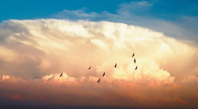 傍晚,雨过天晴,彩霞满天,一群盘旋的鸽子就像飞舞在云朵之上。