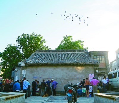 一群鸽子飞过北京大栅栏护国观音寺上空,许多胡同居民喜欢聚集在寺墙外下棋、打牌。
