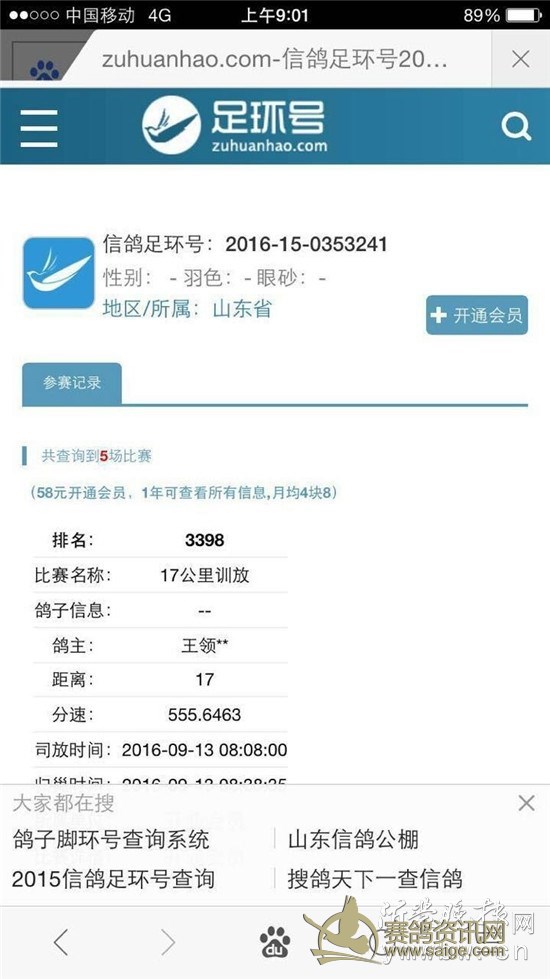 市民通过网上查询到信鸽脚环编码的信息。 21日,市区解放路与工业大道附近一楼盘售楼处内来了一位不速之客——一只受了伤的信鸽,后经工作人员寻找,最终这只信鸽的主人将其接走。 21日,市民李女士给本报打电话,说他们发现了一只受了伤的鸽子。“与其说是被我们捡到的,到不如说是它是自己主动过来寻求帮助的。”李女士告诉记者,当天上午8时许,这只信鸽大摇大摆地从售楼处大门走了进来。 “见到人它也不害怕,也不闪躲,任由人上去抱着它、抚摸它。可以看出它经常和人亲近,而且是经过训练的。”李女士告诉记者,当大伙把鸽子拿到手里才发现,这个鸽子的翅膀受伤,已经无法飞翔了。“原来它是主动过来寻求我们帮助的!” 后经人们检查发现,这只鸽子身上绑了脚环,上面还有编码:CHN-2016-15-0353241。经过网上查询后,发现这个鸽子来头并不简单,是一只信鸽,之前参加过很多次比赛。“根据网上查询的信息,只知道鸽子主人姓王,但具体名字及联系方式就不知道了。”李女士表示他们会尽快想办法找到鸽子的主人,“自从来到我们这里,鸽子不吃不喝,我们也不知道该如何给它治伤,还是希望早日找到他的主人。” 21日下午,李女士告诉记者,经过他们的努力寻找,现在已经找到鸽子主人。后经了解,鸽子主人王先生是枣庄人,临沂鸽会组织的2016年秋季120公里训放于21日上午7点20分开笼,这只鸽子也是其中之一,中途可能因为发生意外受伤。 捡到信鸽该咋办? 据介绍,信鸽丢失的原因有很多,外出可能遇到鹰、鹞、隼等,信鸽在躲避这些天敌追逐时,撞上其他物体而跌落受伤,还有的信鸽也会迷失方向和生病,其次就是人为的抓捕。 临沂信鸽协会工作人员介绍,市民捡到信鸽之后,要了解信鸽是食素的,它爱吃高粱、玉米、豌豆、绿豆和水。每只信鸽的脚环编码,用于识别和防伪,不过因为规定脚环不能透露鸽主个人信息,只作为鸽子主人识别是否自家鸽子所用。 捡到鸽子的市民可查询临沂信鸽协会网站,协会会尽快联系鸽主,送信鸽回家。记者张斌