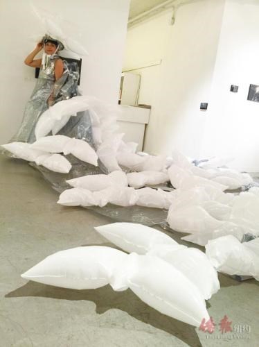 孔宁表示,她自2005年开始做行为艺术表演,近十年一直做以“嫁”为主题的环保、生命装置等行为艺术,如《嫁给蓝天》、《嫁马》等。今次这套“鸽子婚纱”重约20斤,对她来讲,还是轻的。最重的一件是她几年前在黑龙冮表演时的那件“战衣”,重达200斤。(叶永康)