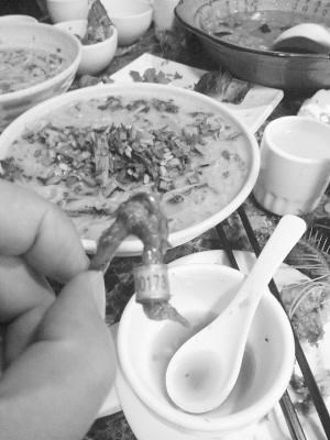 昨日,市民李先生拨打本报新闻热线,称他在周口中心城区文明路一家饭店吃饭时,发现吃的卤鸽腿上套着塑料环(如图)。李先生说,他近日和朋友一起去文明路一家饭店吃饭,见菜单上有卤鸽,就要了几只。“这鸽子腿上咋有个绿环啊?”吃得正香时,一个朋友惊奇地说。