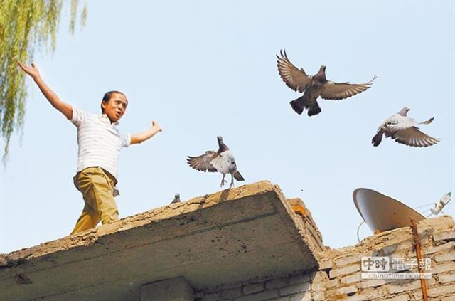 太原一养鸽人在房顶训练信鸽。 (新华社)