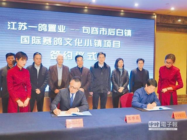一鸽集团21日在江苏镇江与句容市后白镇签约,将携手打造全球最大的国际赛鸽产业特色园区。(记者陈曼侬摄)