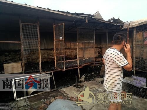 鸽子主人在伤感地看着被烧的鸽子笼。记者颜篁 摄