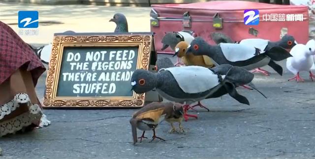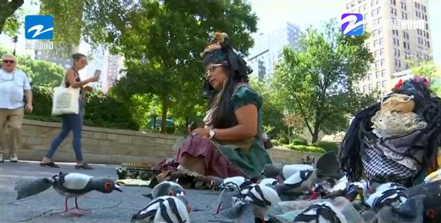 视频截图:美国“鸽子妈妈”缝制鸽子布偶引来了路人的关注