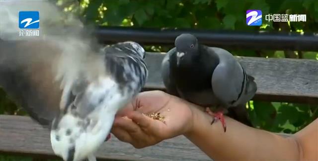 视频截图:美国“鸽子妈妈”手中的饲料吸引了鸽子