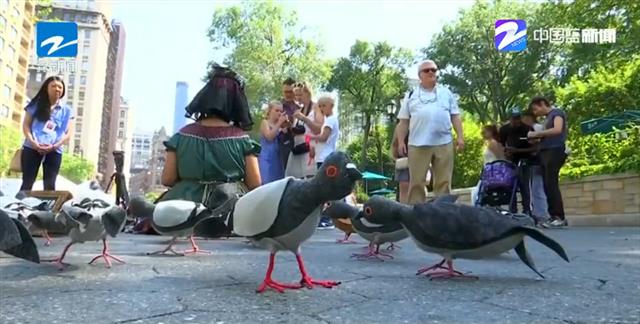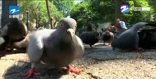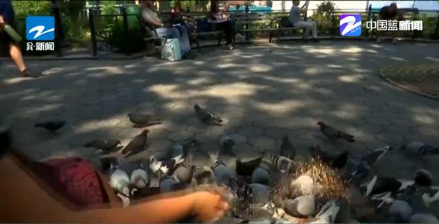 视频截图:美国“鸽子妈妈”将饲料撒向鸽群