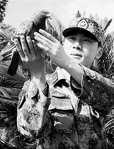 对于从军队中退伍或仍在执勤的“军中男儿”来说,鸽子就是他们生活中不可缺少的一部分。图为新疆沙雷比留克边防派出所的官兵与他的鸽。